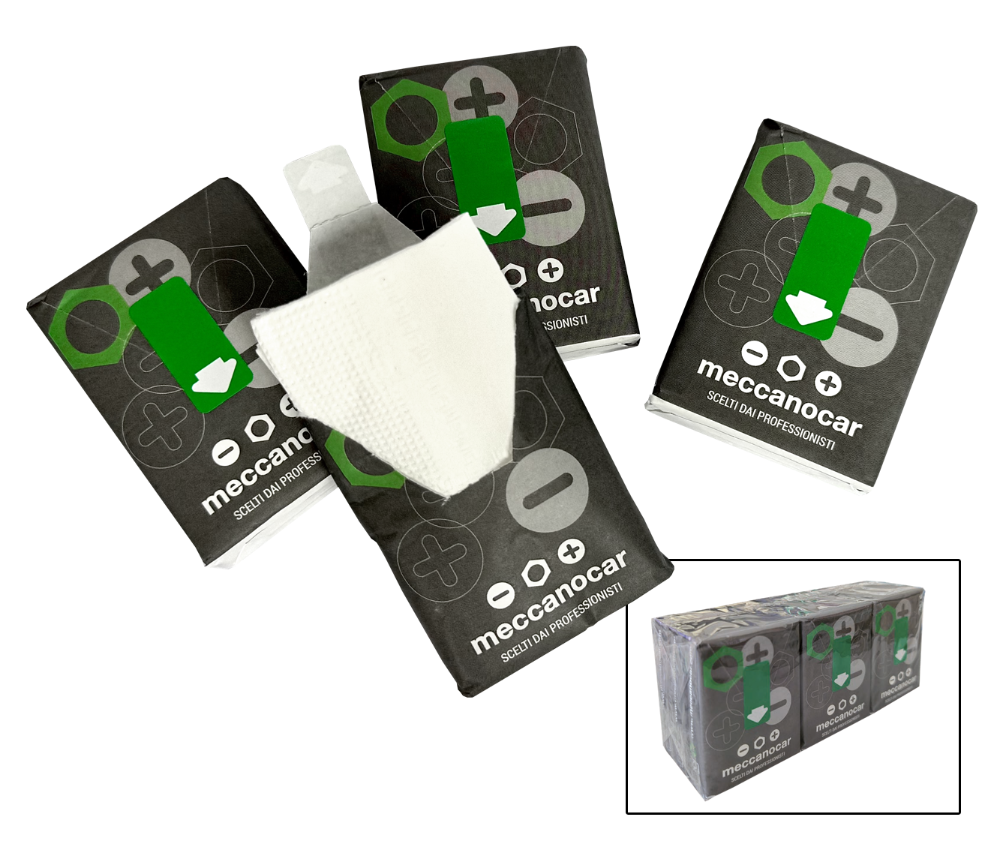 • Pack of 9 personalized tissues with Meccanocar texture. Compostable packaging.