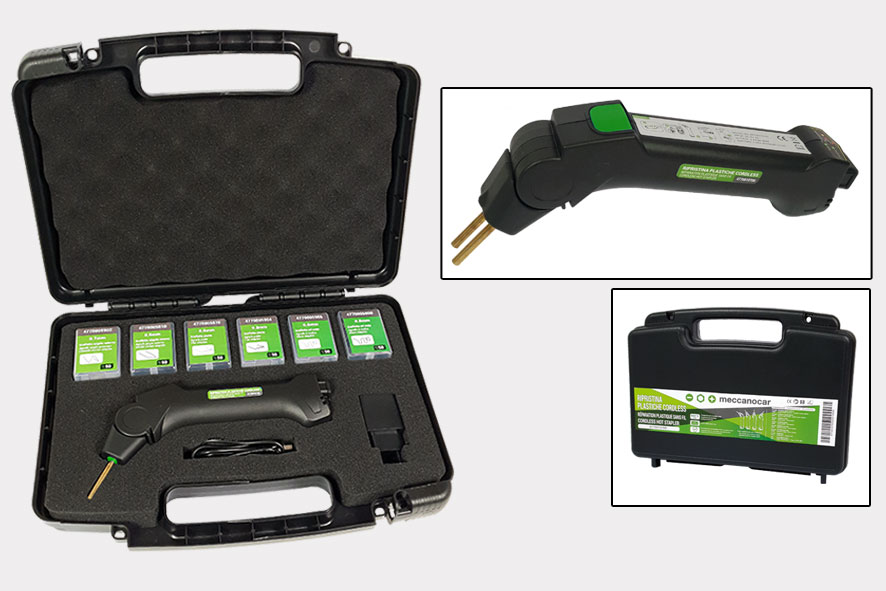 - Battery-operated hot stapler for joining and reinforcing the breakage points of plastic components such as car bumpers with specific metal staples.
